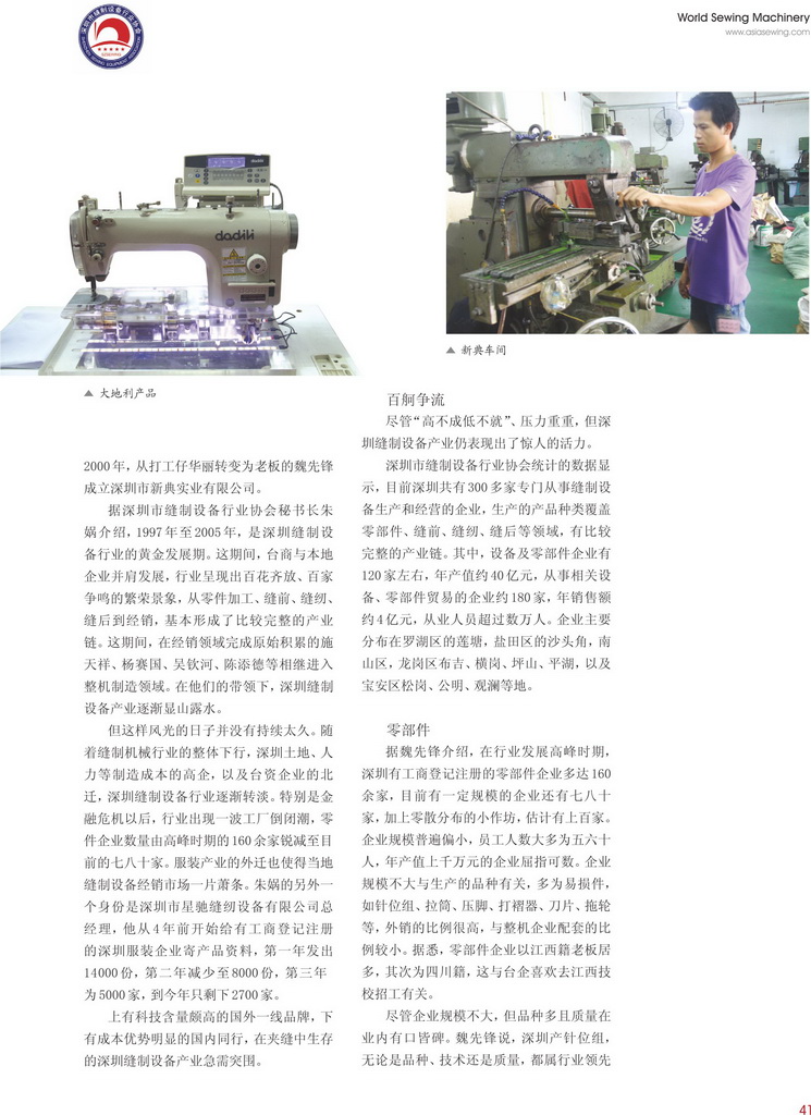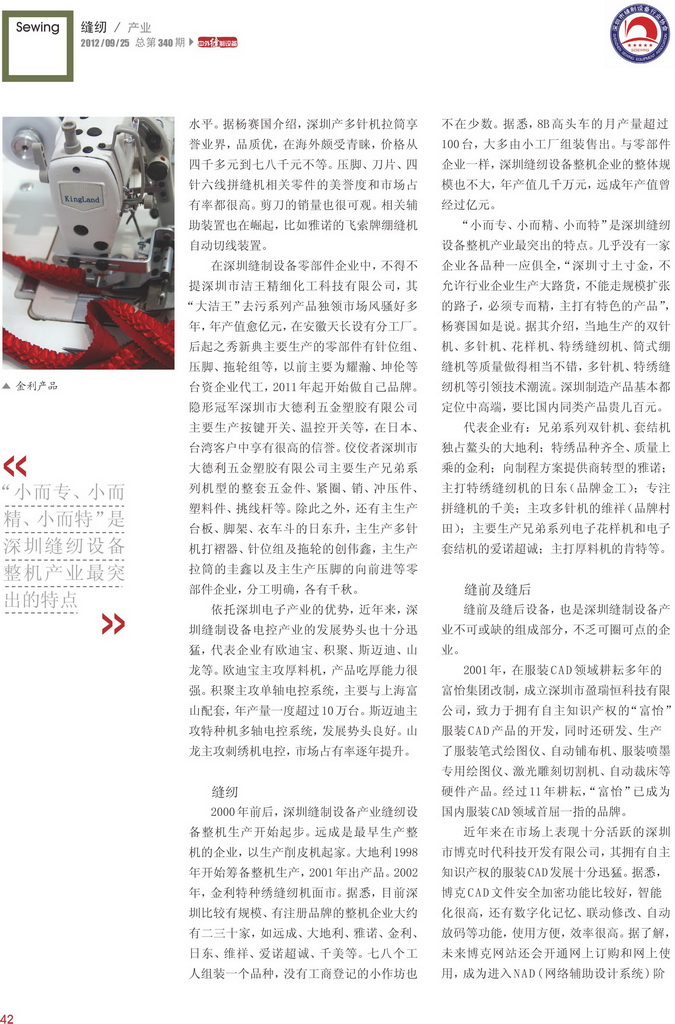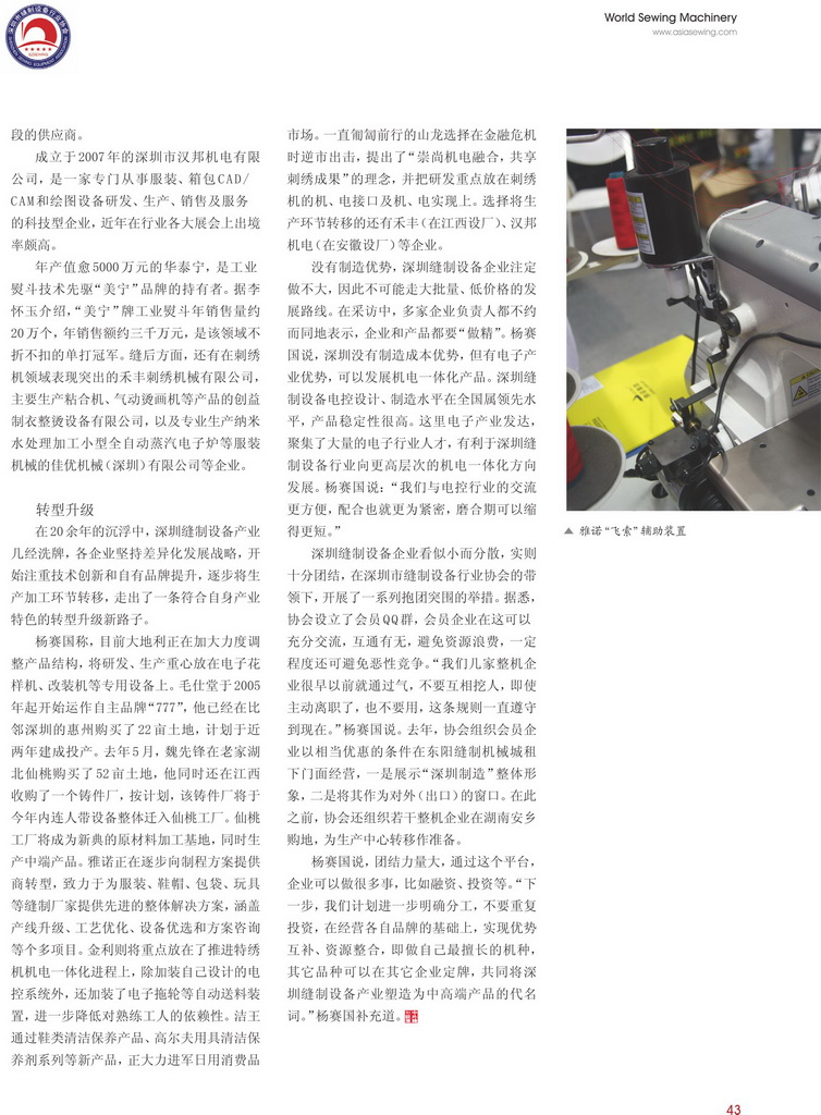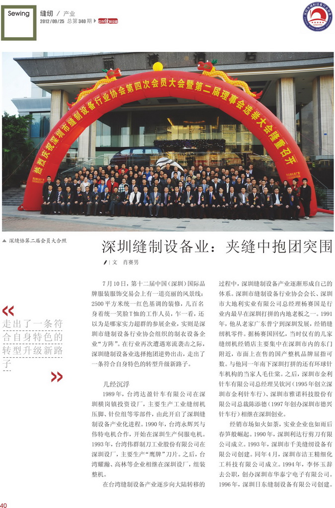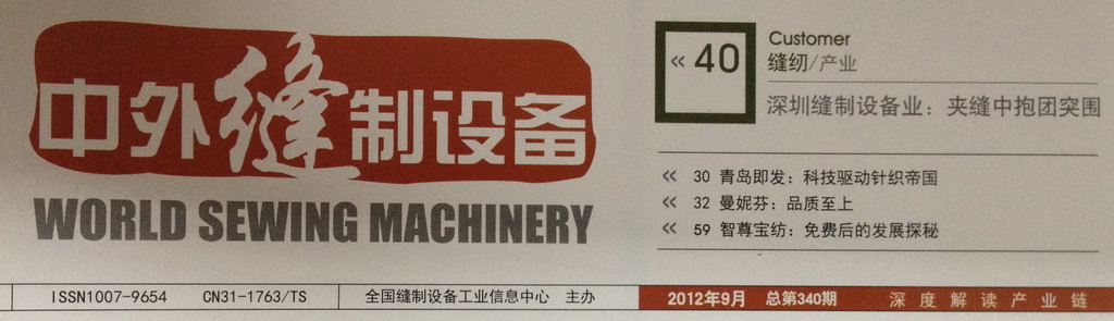 《中外缝制设备》2012年第9期刊登了“深圳缝制设备业:夹缝中抱团突围”的文章(40P-49P)