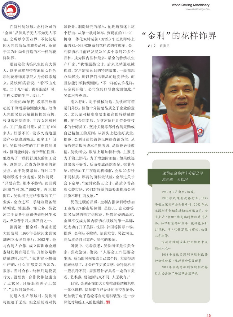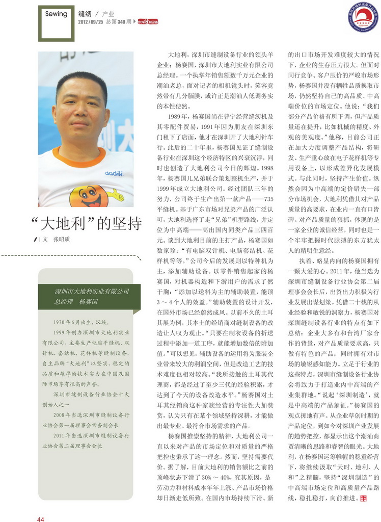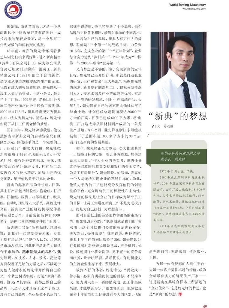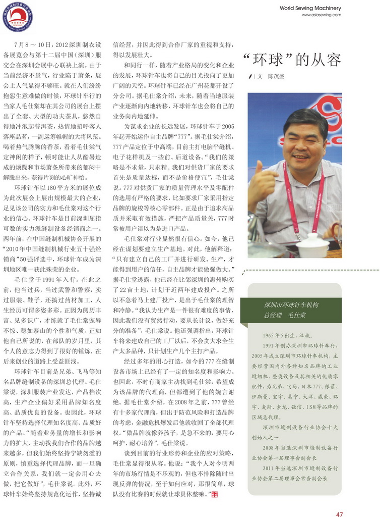 《中外缝制设备》2012年第9期刊登了“深圳缝制设备业:夹缝中抱团突围”的文章(40P-49P)