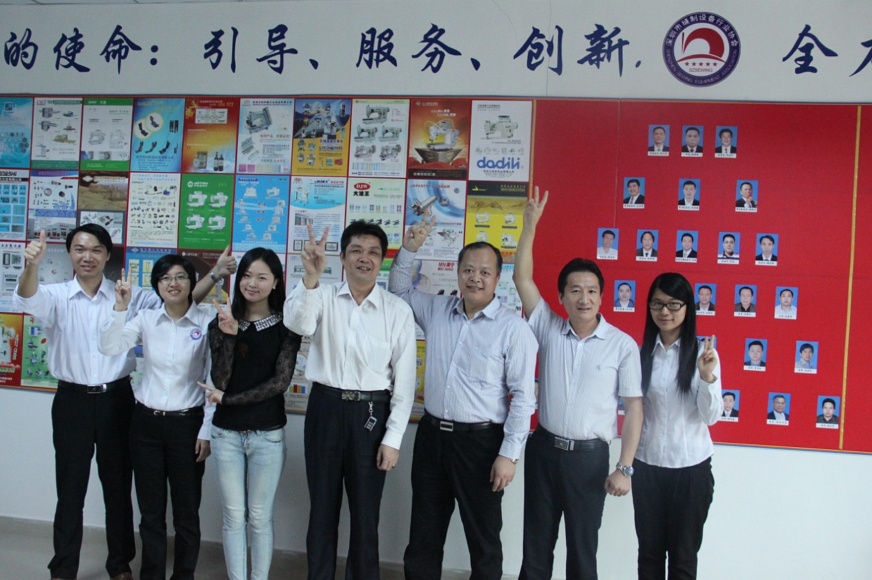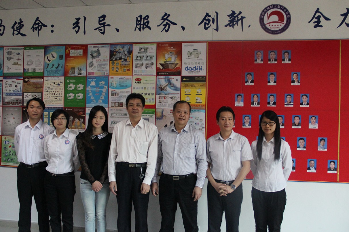 右三:江苏省工商联缝制设备商会秘书长高家平;左三:江苏省工商联缝制设备商会办公室主任张新玉;左四:深缝协监事长吴钦河;右二:深缝协秘书长朱娲;左一、左二、右一:深缝协秘书处工作人员