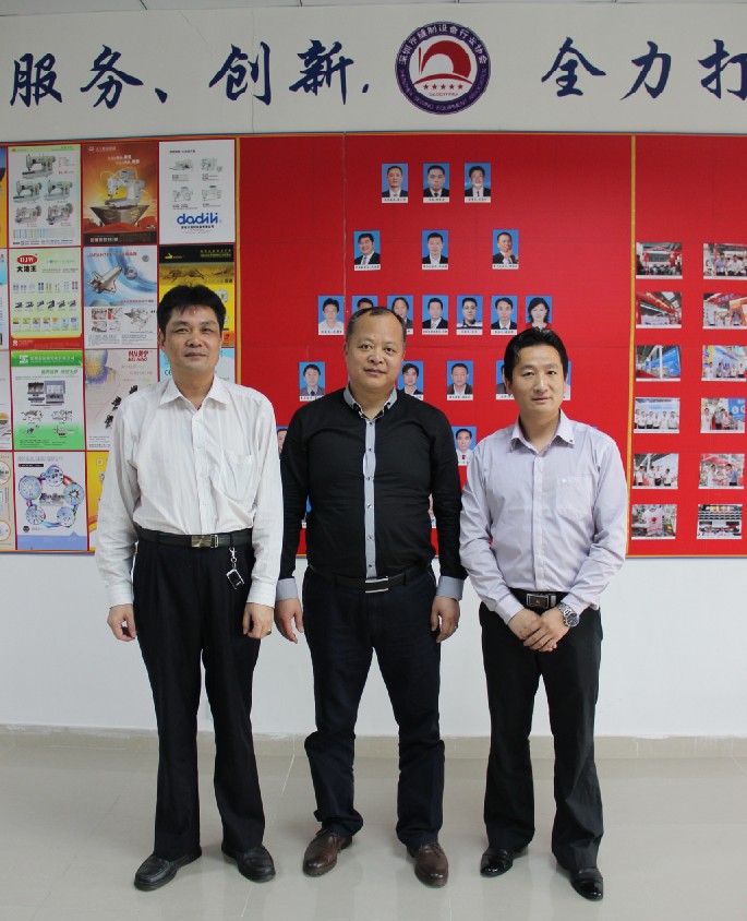 中:江苏缝制商会副会长兼秘书长高家平;左:深缝协监事长吴钦河;右:深缝协秘书长朱娲