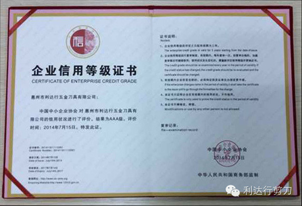 该证书的获得对利达行来说是激励,更是鞭策,作为全国刀剪示范单位,惠州市利达行五金刀具有限公司,将再接再厉,更创辉煌!