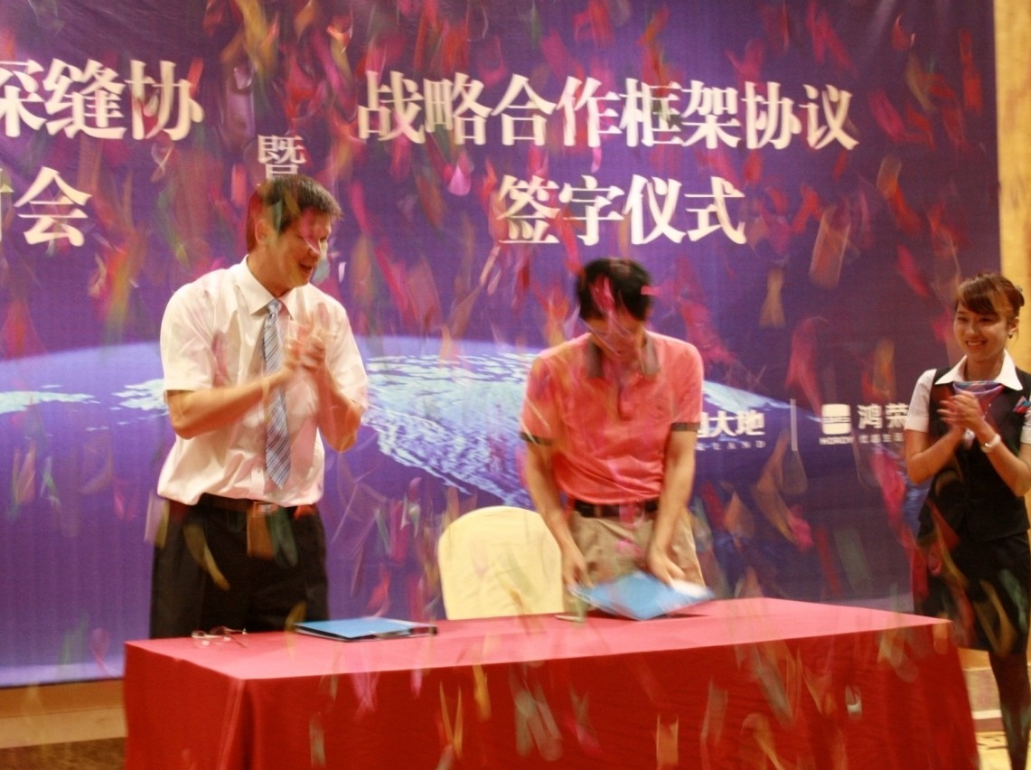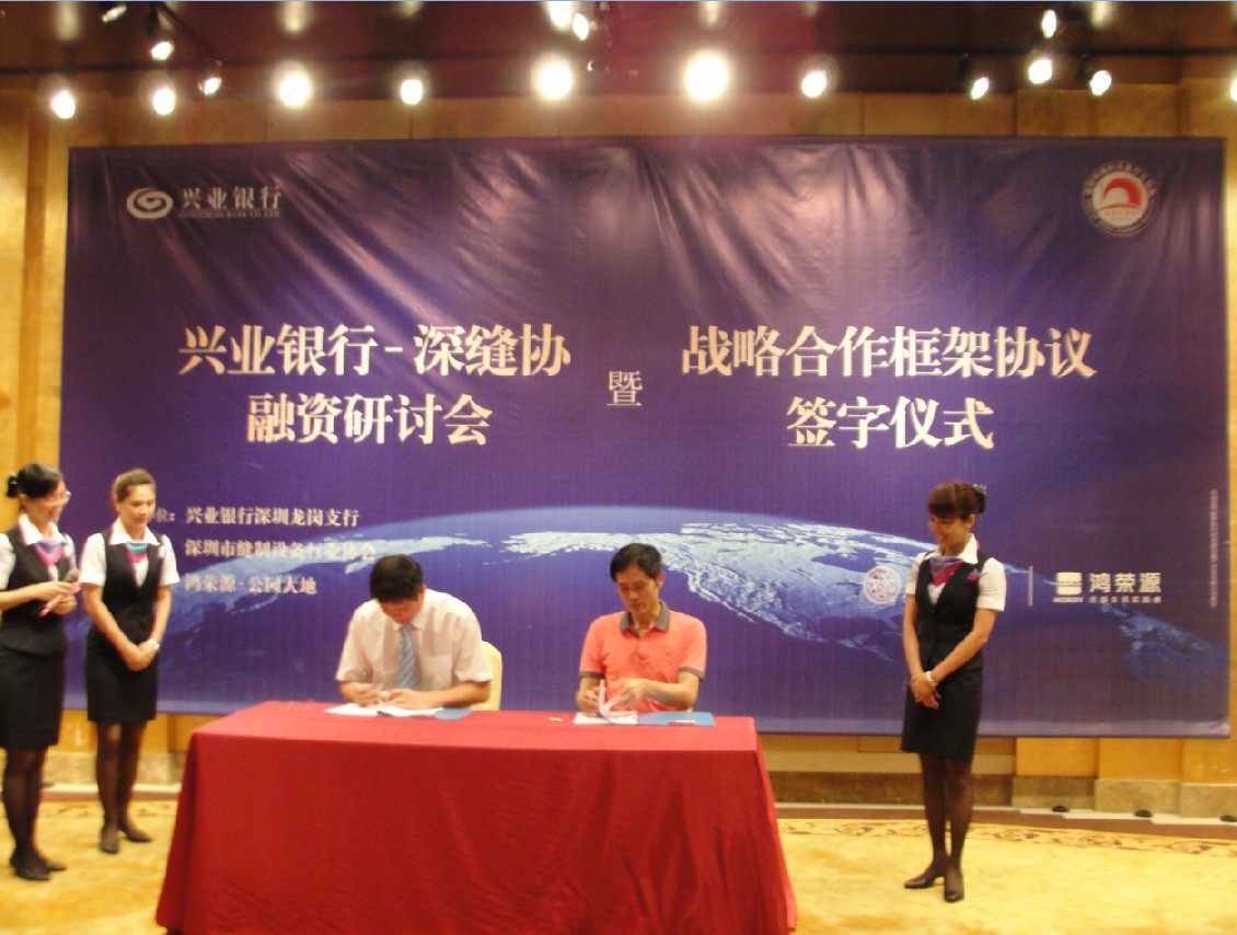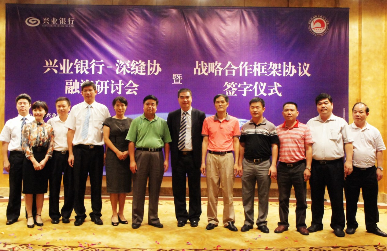2011年6月23日下午15时,由兴业银行深圳市分行龙岗支行和深圳市缝制设备行业协会共同主办的“兴业银行—深圳市缝制设备行业协会融资研讨会暨战略合作框架协议签字仪式”在龙岗区中心城公园大地一期113号举行。出席大会的有兴业银行深圳分行党委委员、副行长、零售总监胡麟、深圳市缝制设备行业协会会长施天祥、龙岗区科技创新局局长陈广文、兴业银行深圳市分行龙岗区支行行长李锦奎、兴业银行深圳市分行龙岗区支行零售专管行长温晓霞、兴业银行深圳市分行龙岗区支行张晓凤、周克林、林云峰、深圳市缝制设备行业协会常务副会长杨赛国、毛仕棠、秘书长苏想起,深圳市缝制行业协会会员企业董事长或总经理及财务总监、兴业银行深圳市分行龙岗区支行、深圳市缝制设备行业协会秘书处工作人员等70余人。
