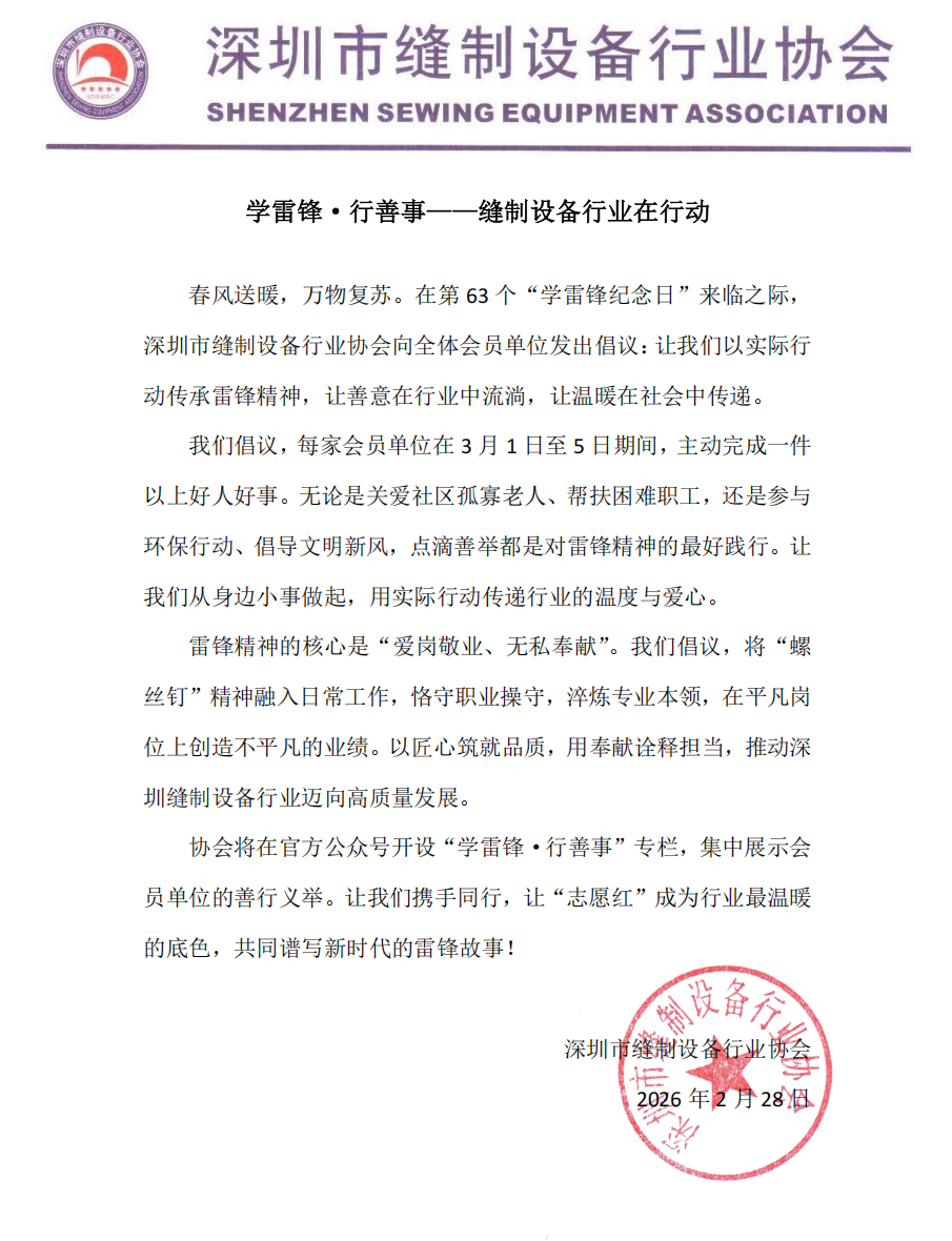 春风送暖,万物复苏。在第63个“学雷锋纪念日”来临之际,深圳市缝制设备行业协会向全体会员单位发出倡议:让我们以实际行动传承雷锋精神,让善意在行业中流淌,让温暖在社会中传递。